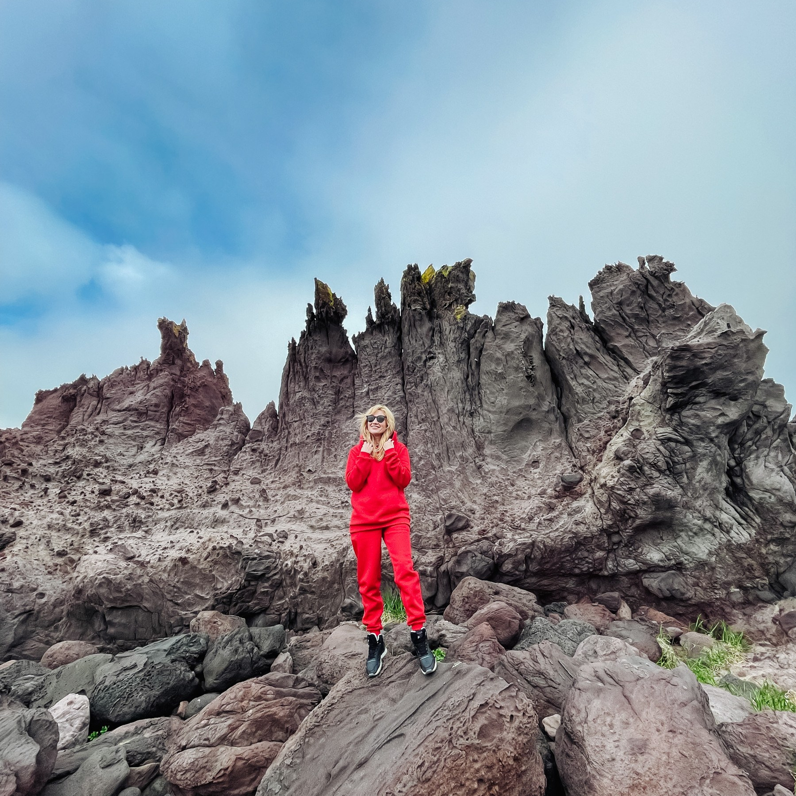 В первый день смотрим г. Курильск и лавовое плато «Янкито». На этом месте огонь встретился с водой и образовал уникальные, ажурные скалы, что возвышаются над курильским заливом